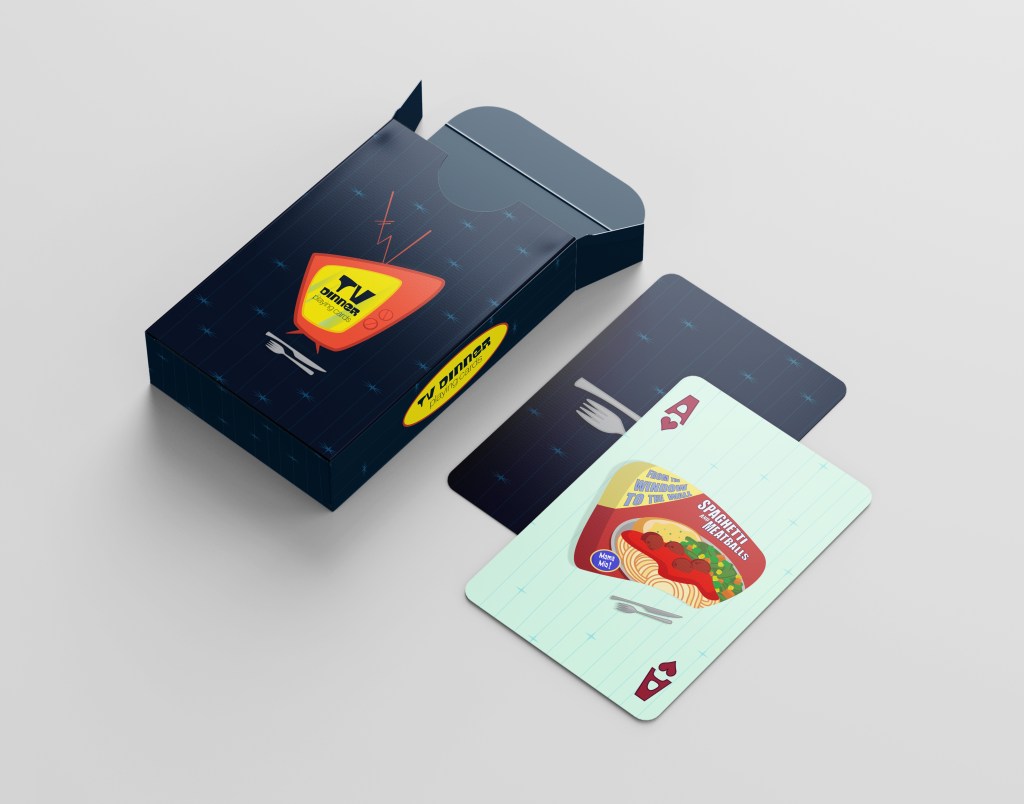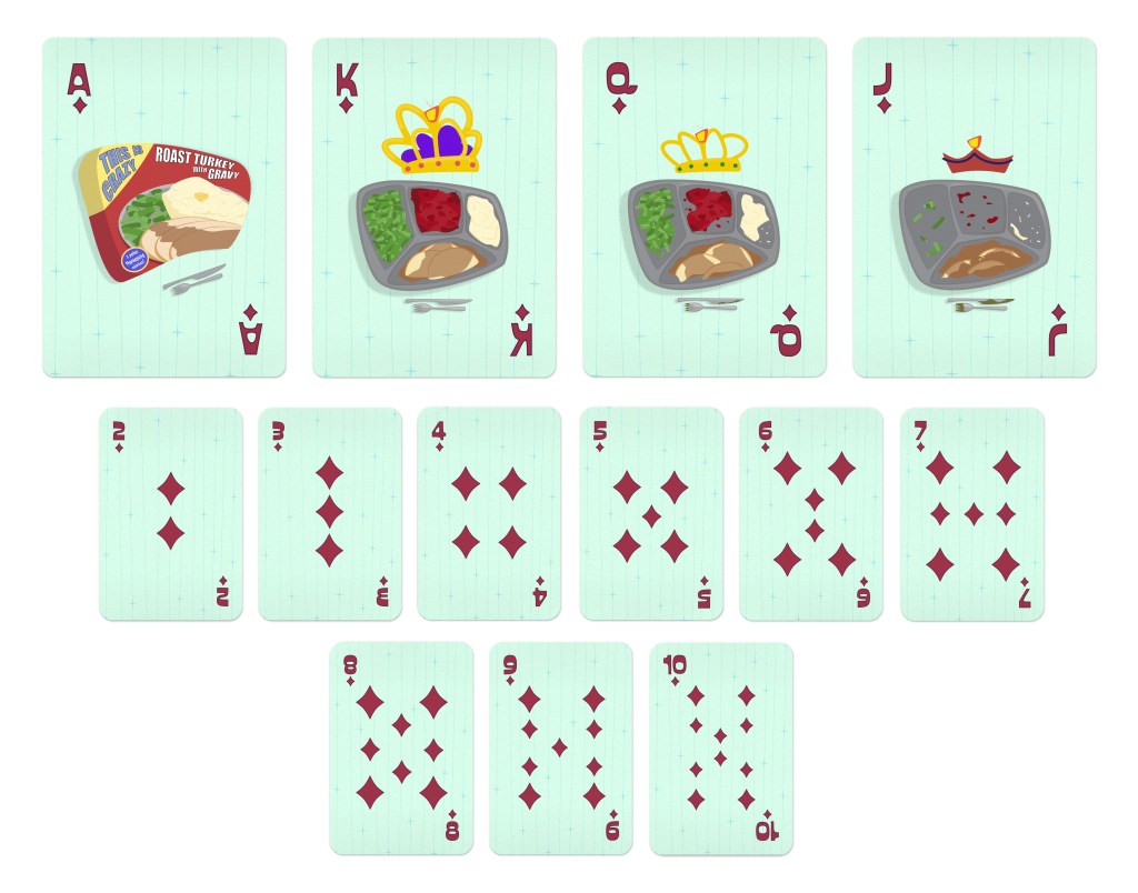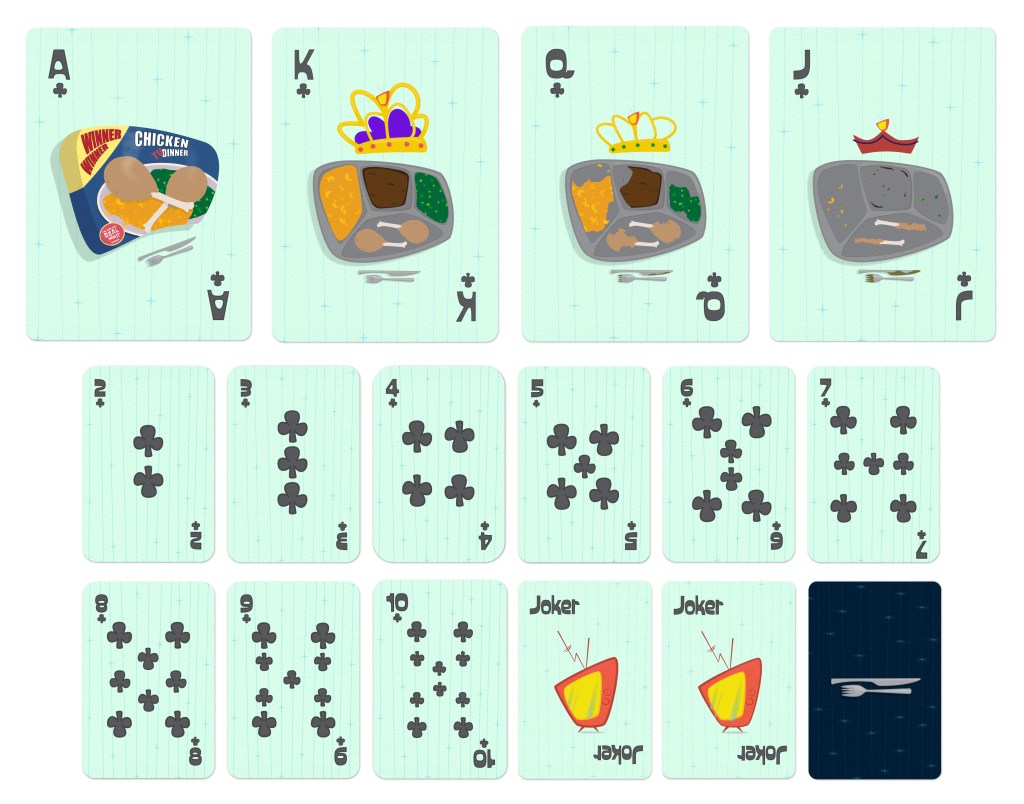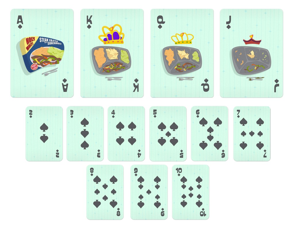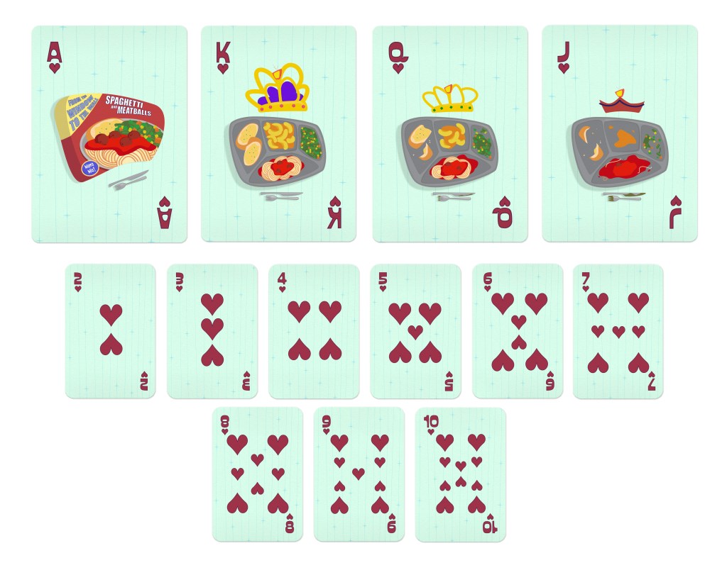 I wanted the playing cards to mirror those themes and give them that 1950s ‘atomic’ feel. Each suit is its own unique meal with a phrase or advertisement on the front.